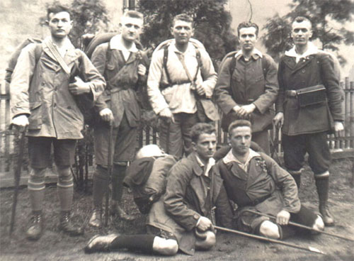 "Aber fort muß er wieder ..." Am Mittwoch kamen wir in die Voralpen und nachmittags 4 Uhr in Zürich an. Nachts und am Tag darauf wieder starker Regen. Wir entschlossen uns, den Züricher See entlang die Bahn zu benützen, und gar gerne hätten wir diese herrlich schöne Strecke zu Fuß gemacht. In Wedenswill marschierten wir gleich weiter am Meinradsbrunnen vorbei, immer höher. Die Luft ist hier oben etwas rauh und kalt, dazu kam plötzlich noch heftiger Schneefall, sodaß wir nur mit Mühe weiter konnten und in Bieberbrücke einen kurzen Halt machten. Nach einer Stunde Marsch hatten wir Einsiedeln vor uns und das berühmte Kloster mit seiner Wallfahrtskirche "Maria-Einsiedeln". Um 7 Uhr abends kamen wir im Gesellenhaus an, wo wir natürlich gut aufgenommen wurden. Am Samstag Morgen nach der hl. Messe besichtigten wir die herrliche Wallfahrtskirche. Weitermarsch mittags 1 Uhr. Nach 2stündigem Wandern kamen wir an ein kleines Häuschen, ein altes Weibchen zeigte uns auf Befragen freundlich den Weg, nur eine Skispur führt weiter, es geht immer höher hinauf. Wir sinken oft bis über die Knie im Schnee ein. nach 1 Stunde haben wir die Spur verloren, alles ist zugeschneit, doch immer weiter bis zu 1500 Meter Höhe. Ein kleines Gebirgshäuschen nimmt uns auf. Bei Milch und Brot erzählt uns der alte Schweizer vom Winter in den Bergen. Am altertümlichen Kachelofen wärmen wir uns und trocknen die Kleider. Bald geht es wieder abwärts. An einer kleinen Kapelle machen wir Halt. Der Eingang ist zugeschneit, aber doch spielt der Schneider [Robert